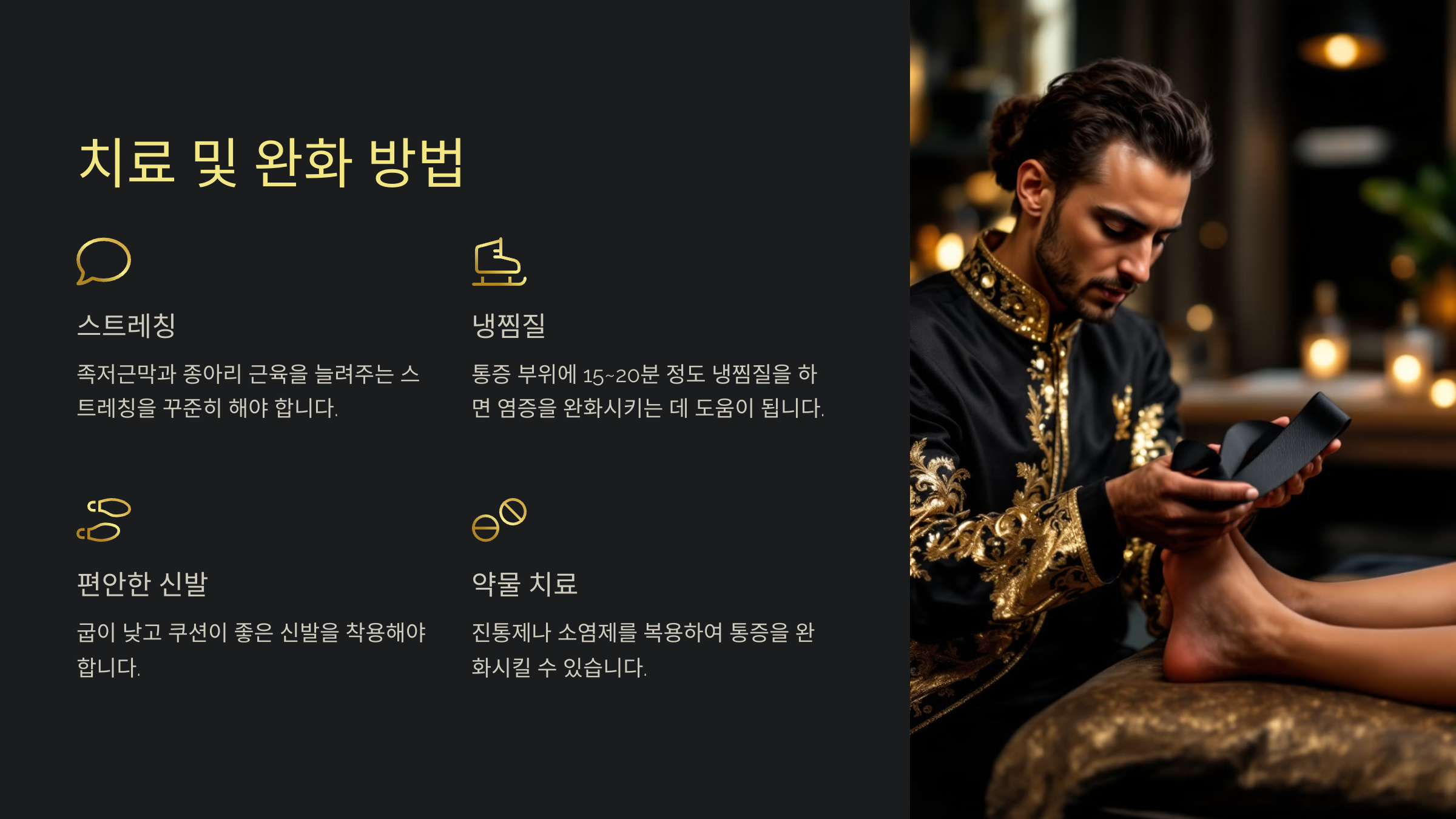 족저근막염 치료는 증상의 심각도와 개인의 생활방식에 따라 달라질 수 있어요. 초기에는 간단한 방법으로 통증을 완화할 수 있지만, 만성화되면 전문적인 치료가 필요할 수 있답니다. 아래는 족저근막염을 완화하기 위한 주요 방법이에요.