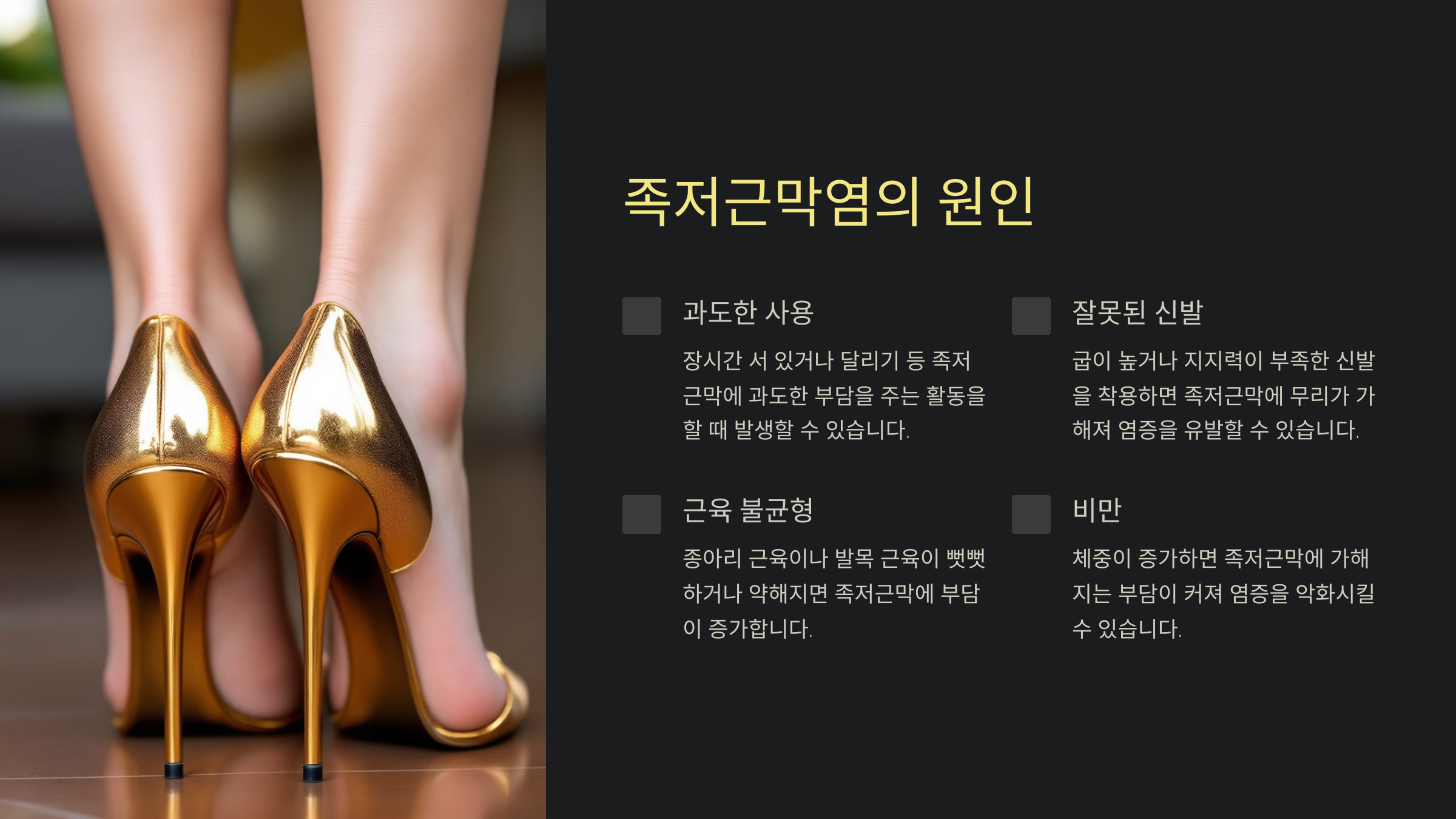 다음은 족저근막염을 유발하는 주요 원인이에요: