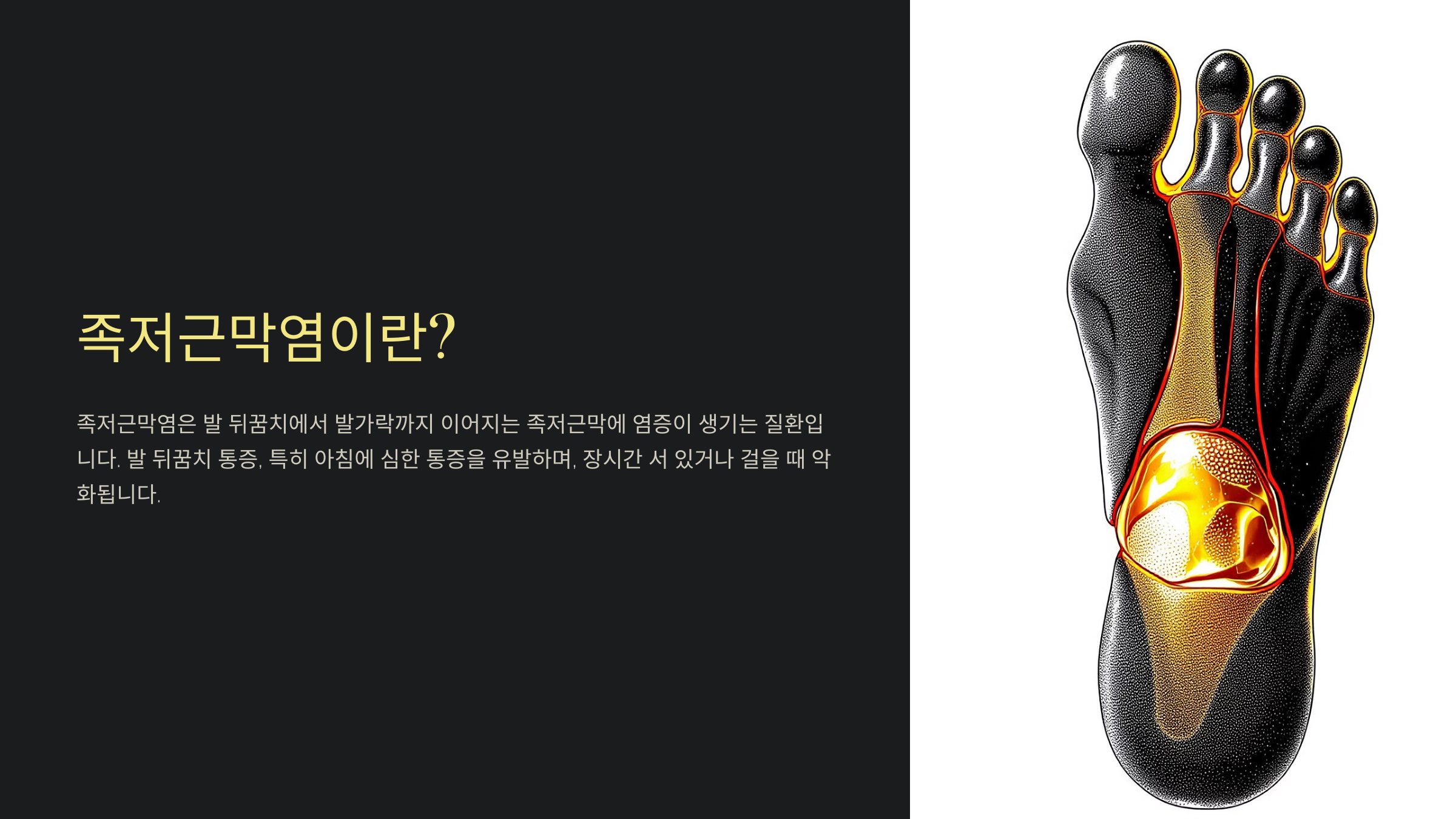 족저근막염은 발바닥 아래쪽에 위치한 족저근막에 염증이 생기는 질환이에요. 족저근막은 발의 아치(arch)를 지탱하고, 충격을 흡수하는 역할을 해요. 이 부위에 반복적인 스트레스나 손상이 가해지면 염증이 생기고, 통증이 발생하게 돼요.