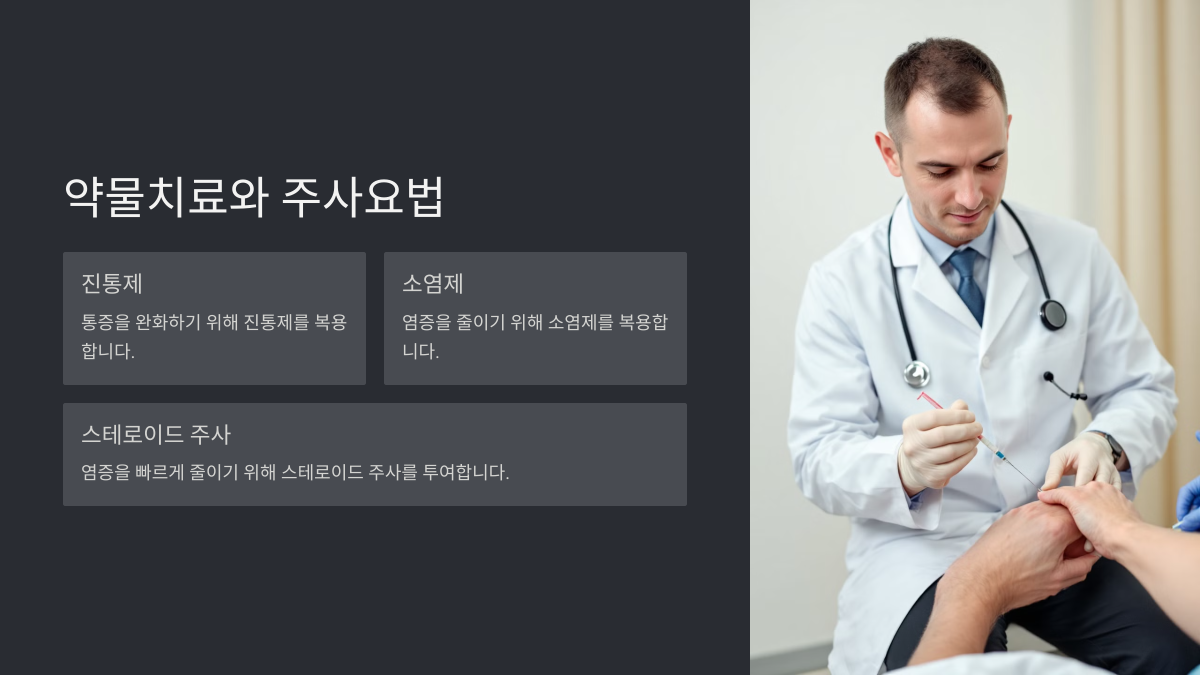 - 비스테로이드성 항염증제(NSAIDs): 이 약물은 염증을 줄이고, 통증을 완화하는 데 도움을 줘요. 의사의 처방에 따라 복용해야 해요.