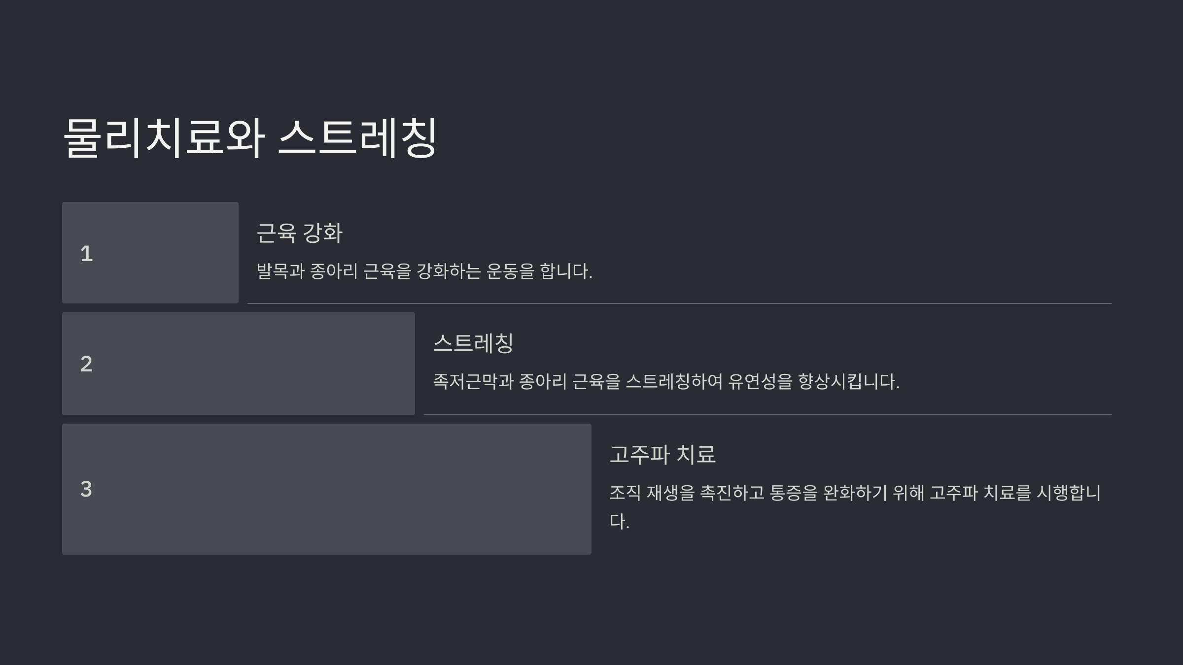 - 스트레칭 운동: 종아리와 발바닥 근육을 늘려주는 스트레칭은 족저근막염 증상을 완화하는 데 효과적이에요. 예를 들어, 벽을 짚고 한 발을 뒤로 뻗은 상태에서 종아리를 늘리는 스트레칭이 유용해요.
