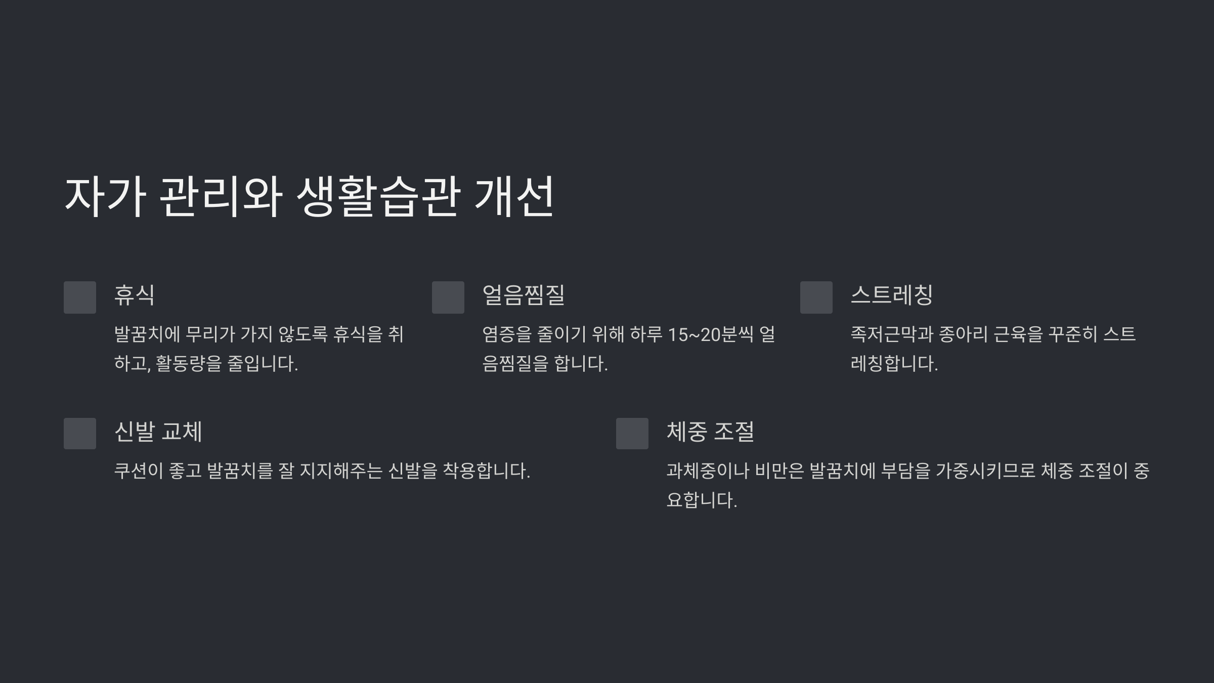 - 발을 쉬게 하기: 증상이 심할 경우, 통증을 줄이기 위해 활동량을 줄이는 것이 좋아요. 특히 장시간 서 있거나 걷는 것을 피해야 해요.