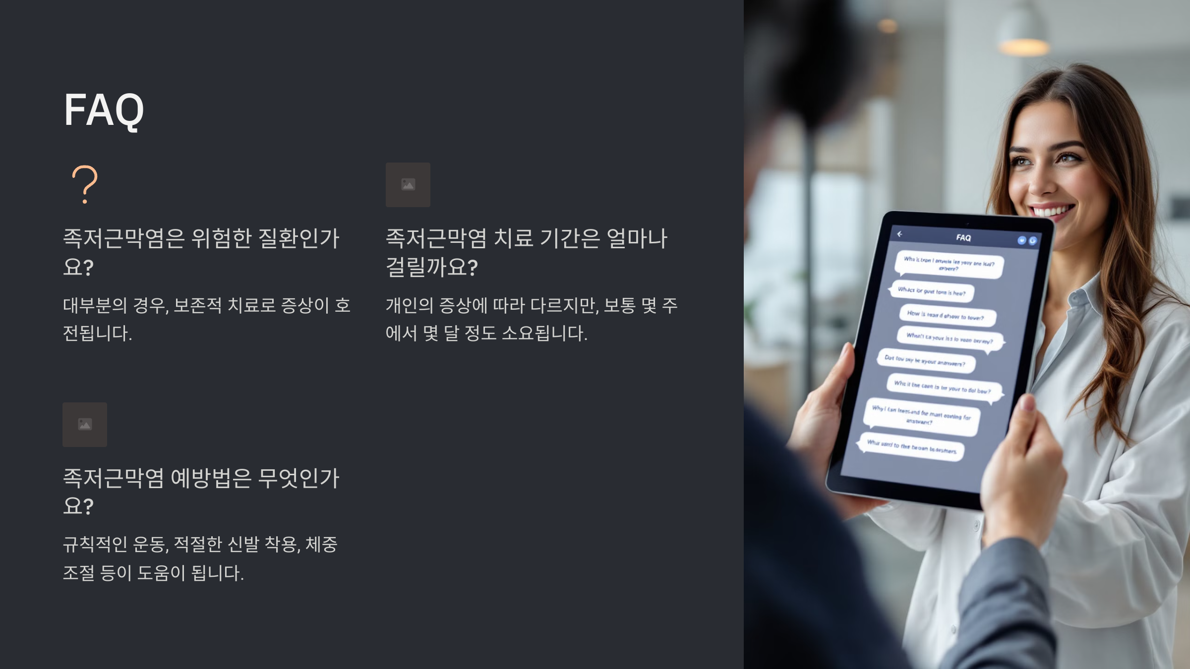이 외에도 스트레칭 운동을 꾸준히 하며 족저근막의 유연성을 높이고, 발바닥의 근육을 강화하는 것이 중요하답니다.