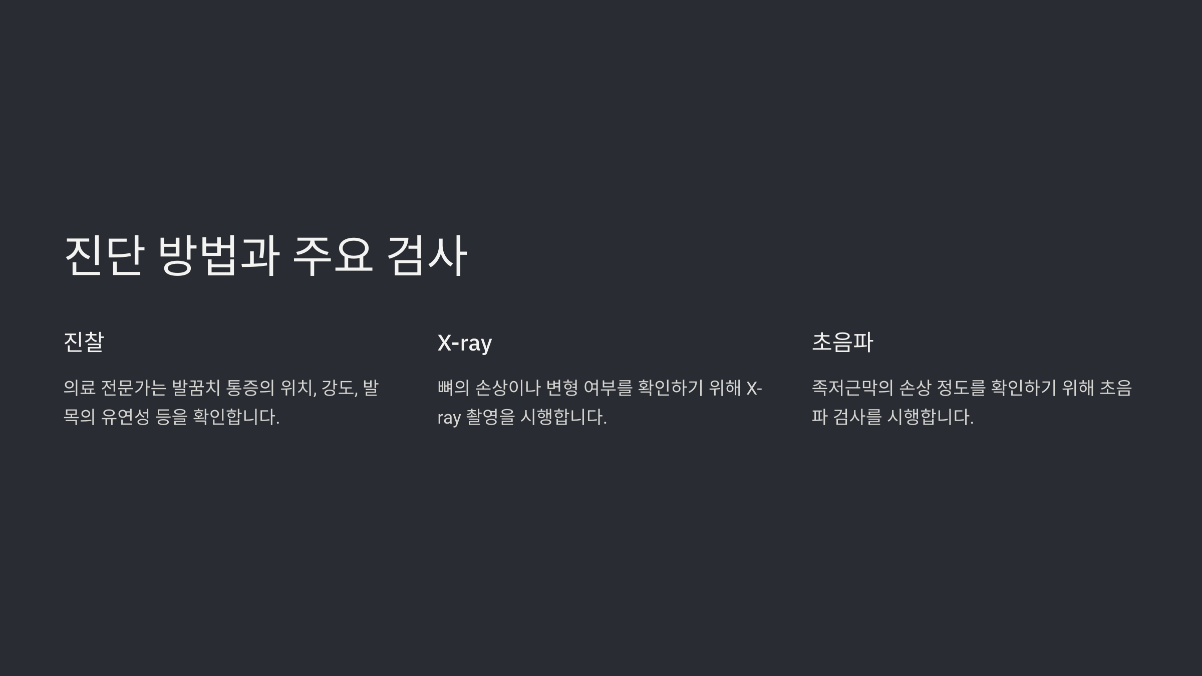 - X-ray 검사: 발뼈에 변형이 있는지 확인하고, 족저근막염과 혼동될 수 있는 다른 질환을 배제하는 데 도움을 줘요.
