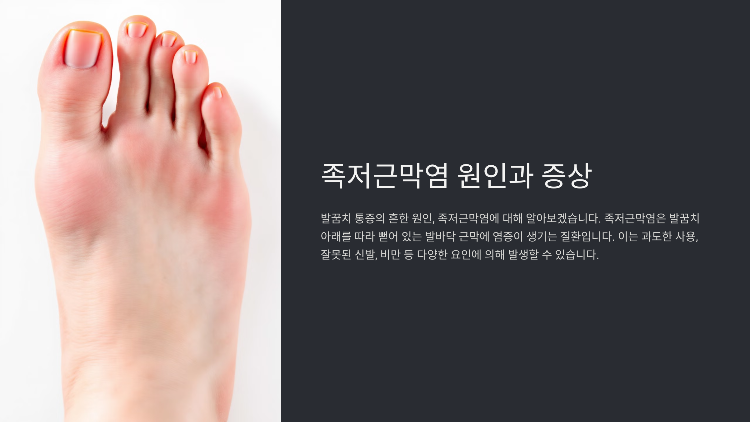 족저근막염은 발바닥의 족저근막에 염증이 생겨 통증을 유발하는 질환이에요. 특히 아침에 첫발을 내디딜 때 발뒤꿈치 통증이 심하게 느껴지는 것이 특징이죠. 이 문제는 오래 서 있거나 과도한 운동을 할 경우 더 악화될 수 있어요.