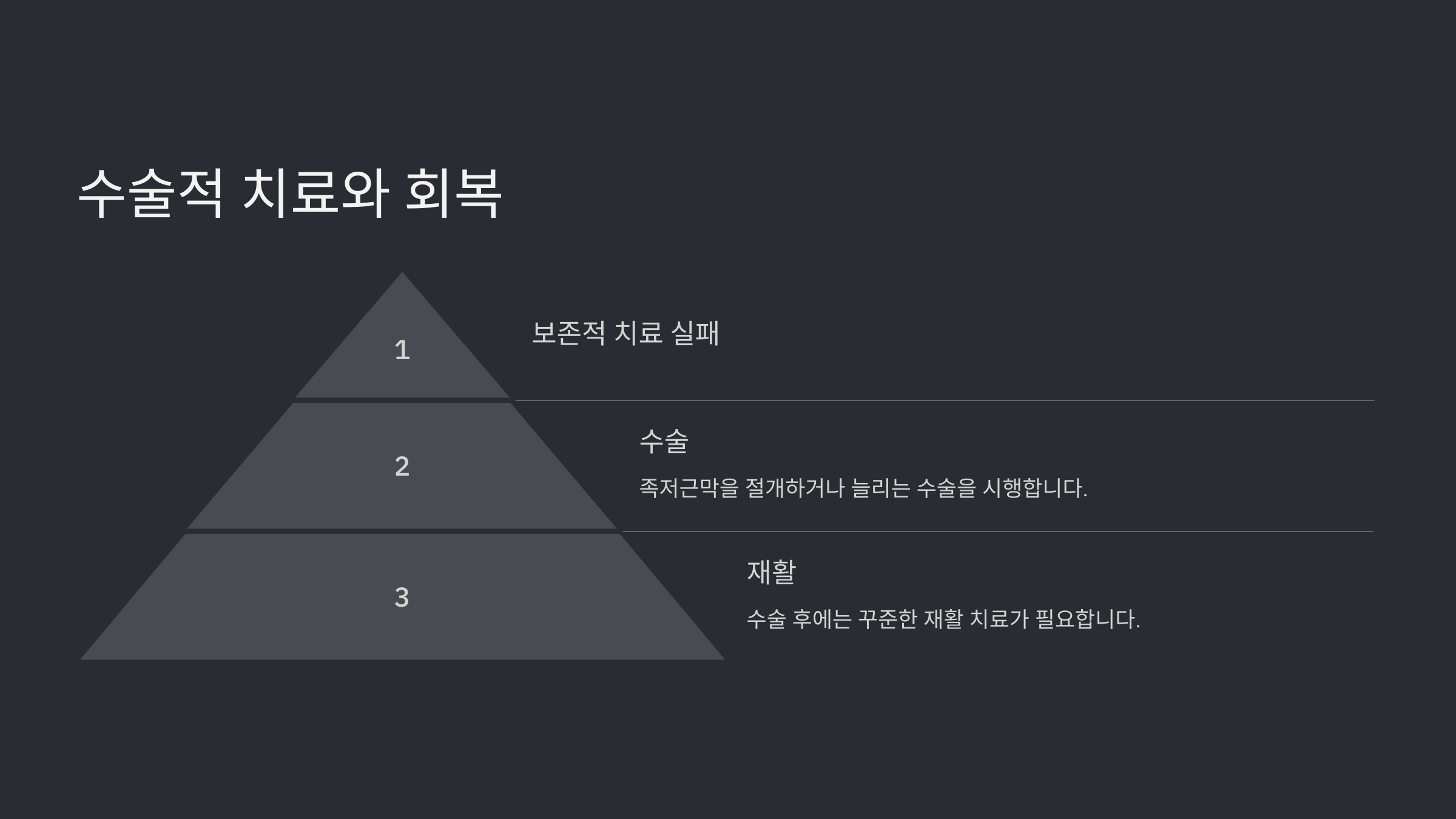 족저근막염은 대부분 비수술적 치료로 회복되지만, 치료에 반응하지 않는 만성적인 경우 수술이 필요한 경우도 있어요. 수술적 치료는 족저근막을 부분적으로 절개하여 압력을 줄이고, 염증을 완화하는 방식으로 진행돼요.