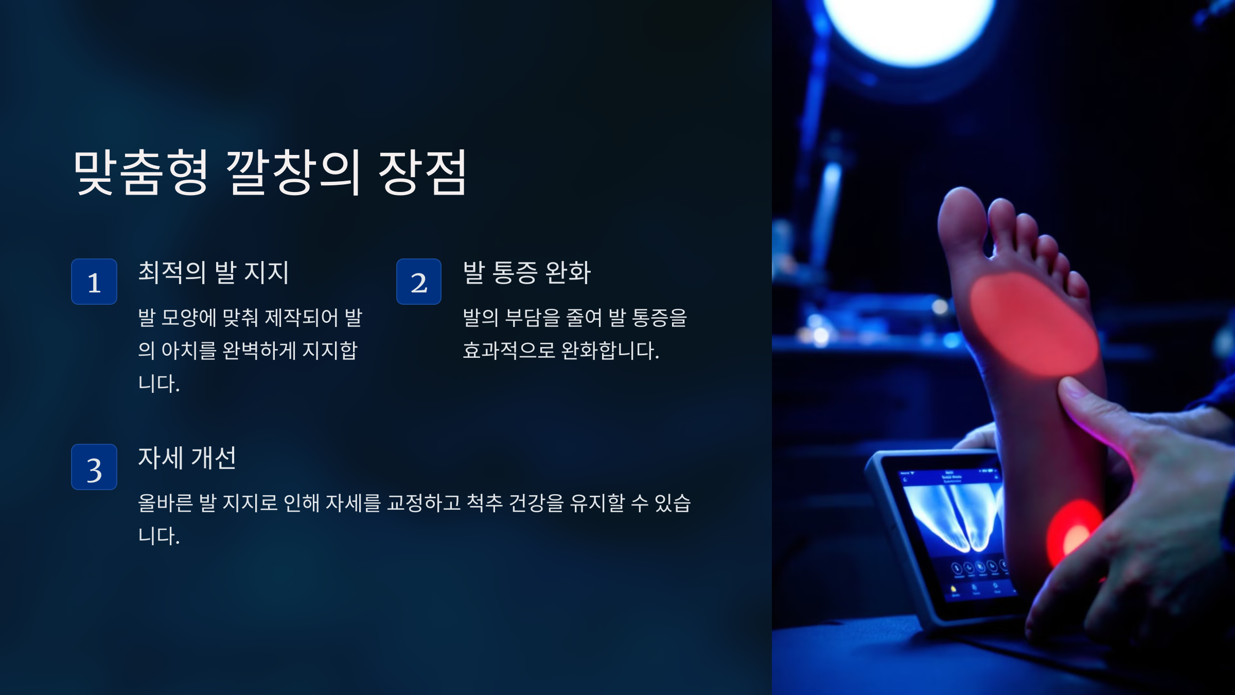 족저근막염, 평발 등으로 인한 통증을 완화하는 데 효과적입니다.