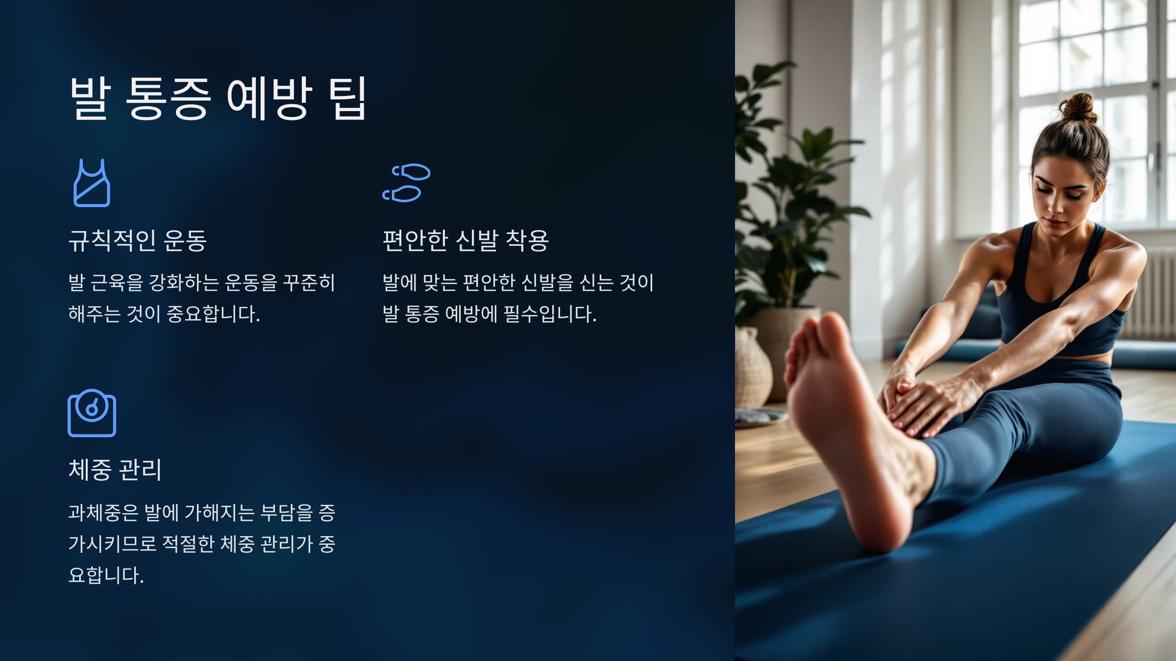 체중 관리를 통해 발에 가해지는 부담을 줄입니다.