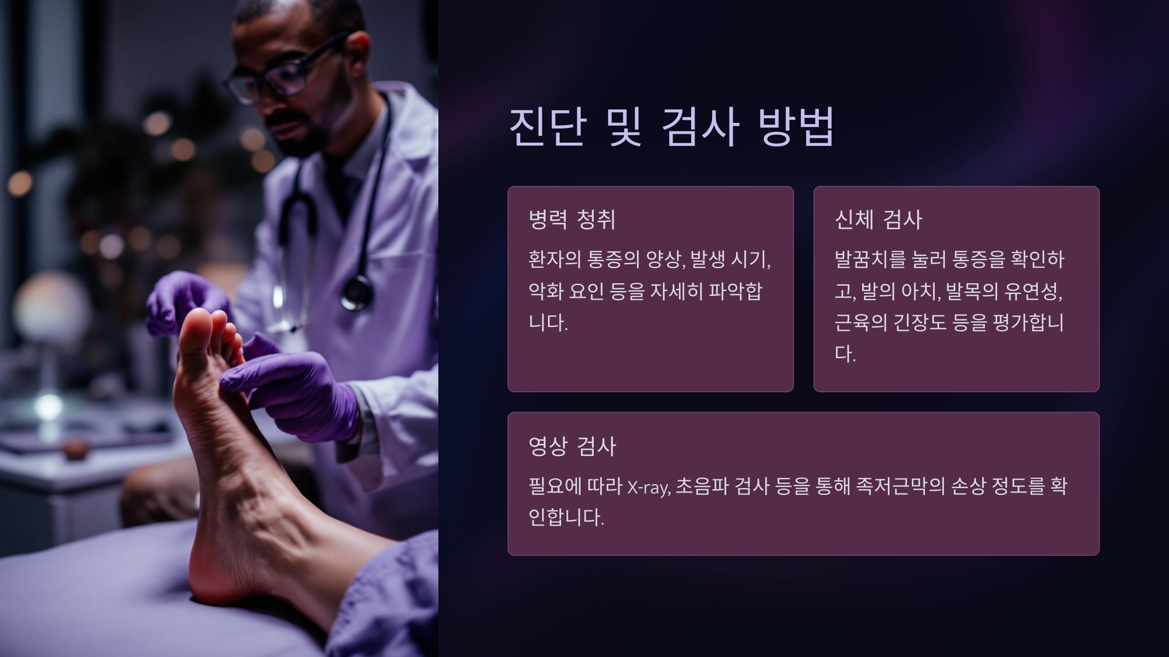 족저근막염을 진단하기 위해서는 먼저 병력 청취와 신체검사가 이루어져요. 의사는 환자의 발뒤꿈치나 발바닥을 눌러 통증의 위치와 정도를 확인하고, 통증이 특정 활동이나 시간대에 더 심해지는지 질문을 통해 평가해요. 이는 족저근막염을 다른 발질환과 구분하는 데 매우 중요한 과정이에요.