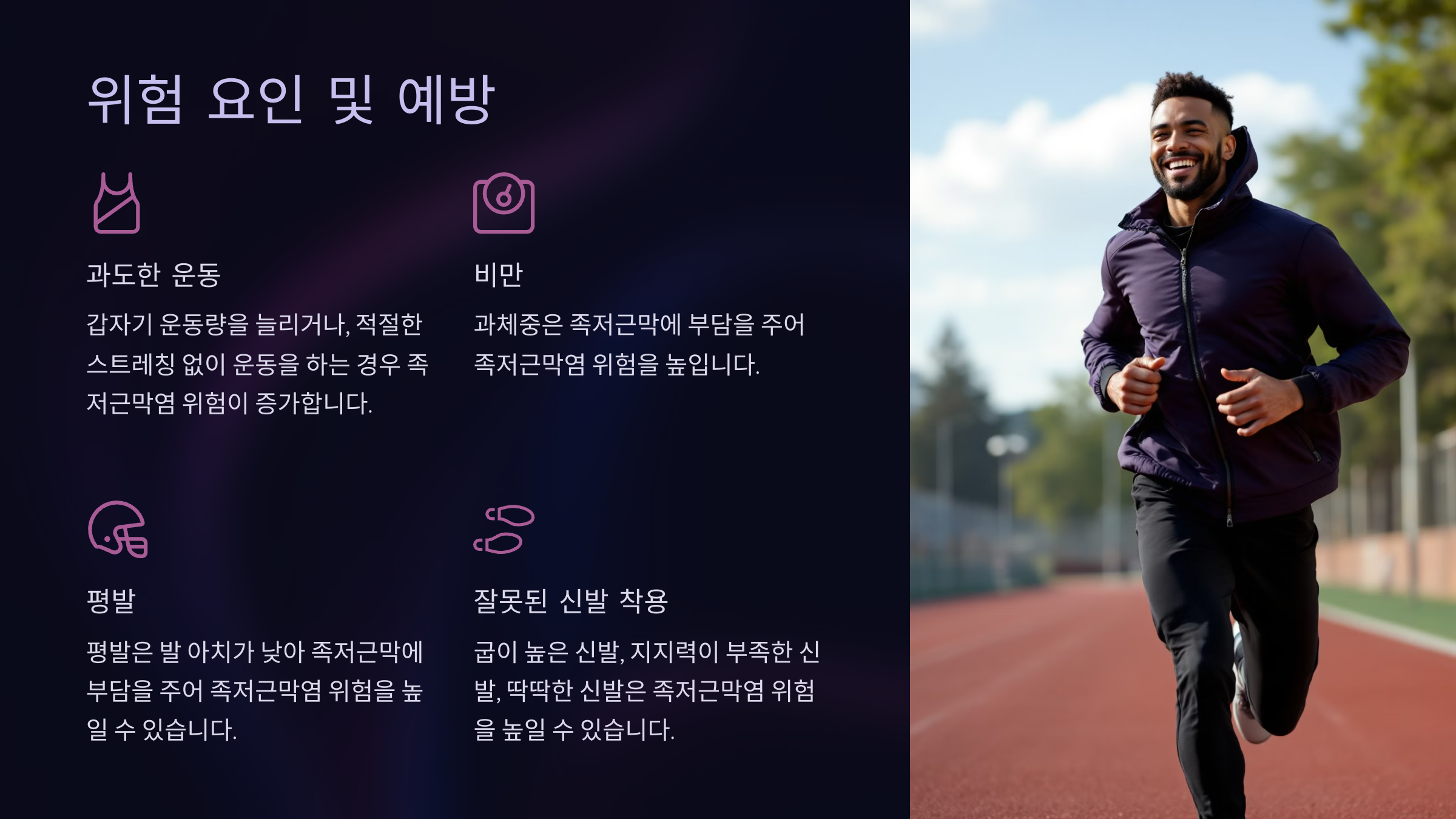 족저근막염의 위험 요인은 주로 생활 습관과 신체적인 특징에서 비롯돼요. 평발이나 요족처럼 발 모양에 문제가 있는 경우, 발바닥에 가해지는 압력이 고르게 분산되지 않아 족저근막염이 발생할 가능성이 커요. 유전적으로 이런 발 모양을 가진 사람은 예방 조치가 필요해요.