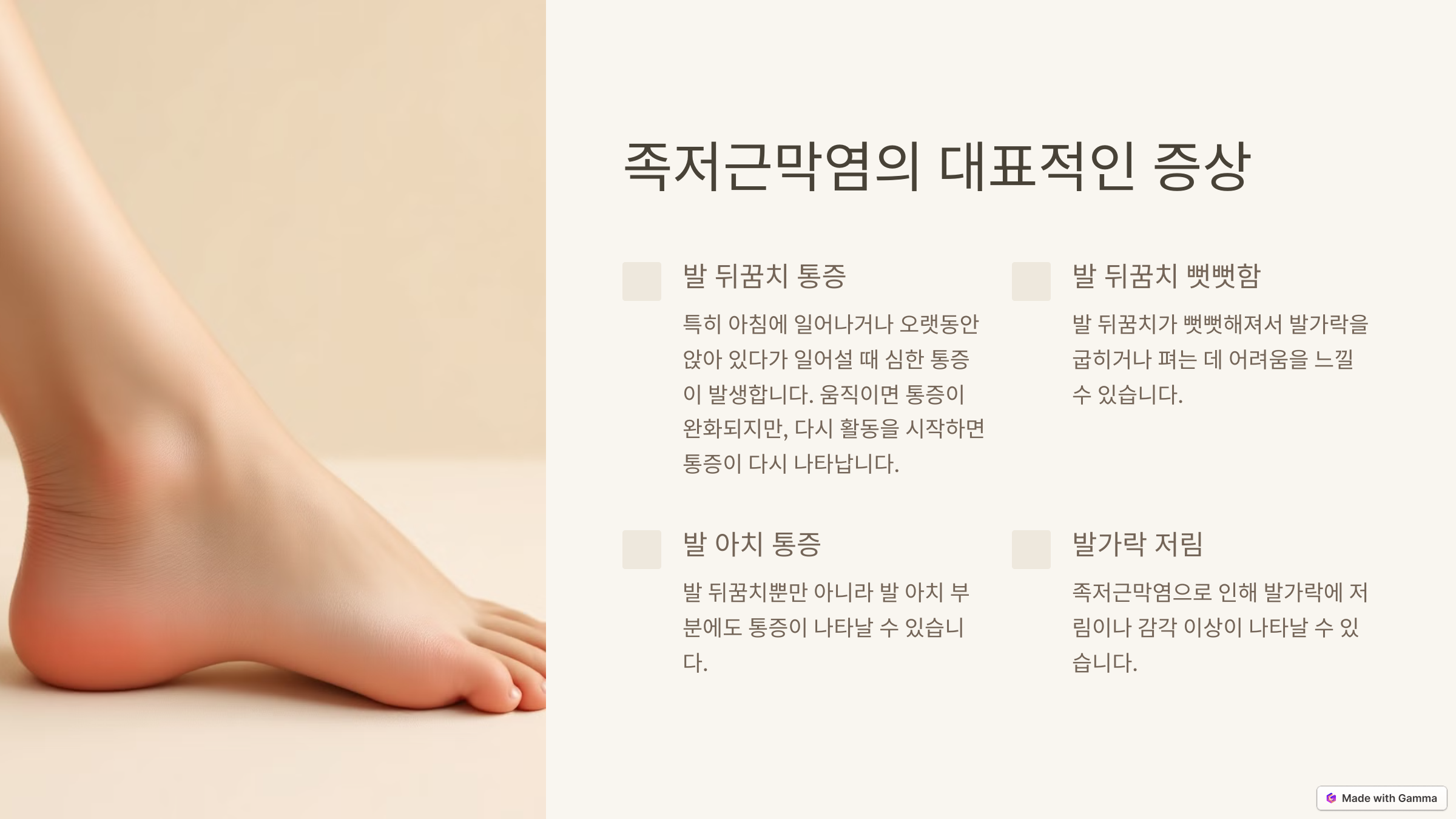 족저근막염은 아침에 첫걸음을 디딜 때 발뒤꿈치에 찌르는 듯한 통증을 느끼는 것이 대표적인 특징이에요. 시간이 지나면서 걸을 때 통증이 점차 완화되지만, 장시간 앉아 있거나 움직임이 적을 때 다시 심해질 수 있어요. 따라서 초기 단계에서 적극적인 관리가 중요하답니다.