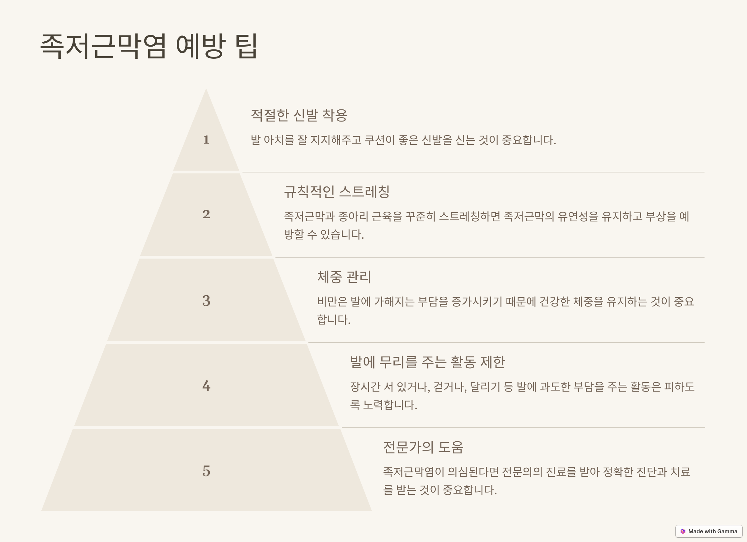 적절한 체중 관리도 중요한 예방 방법이에요. 과체중은 발에 지속적인 압력을 가해 족저근막에 손상을 줄 수 있기 때문에, 규칙적인 운동과 건강한 식습관을 통해 적정 체중을 유지하는 것이 필요해요.