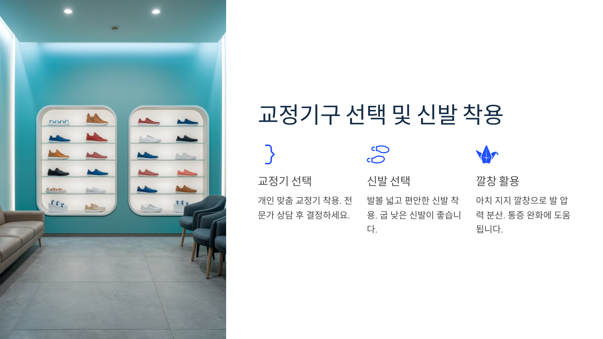 교정기와 깔창을 병행하면 효과가 더 좋아요! 만약 통증이 심하다면 의료용 교정기를 사용해 보는 것도 방법이에요. 🩹