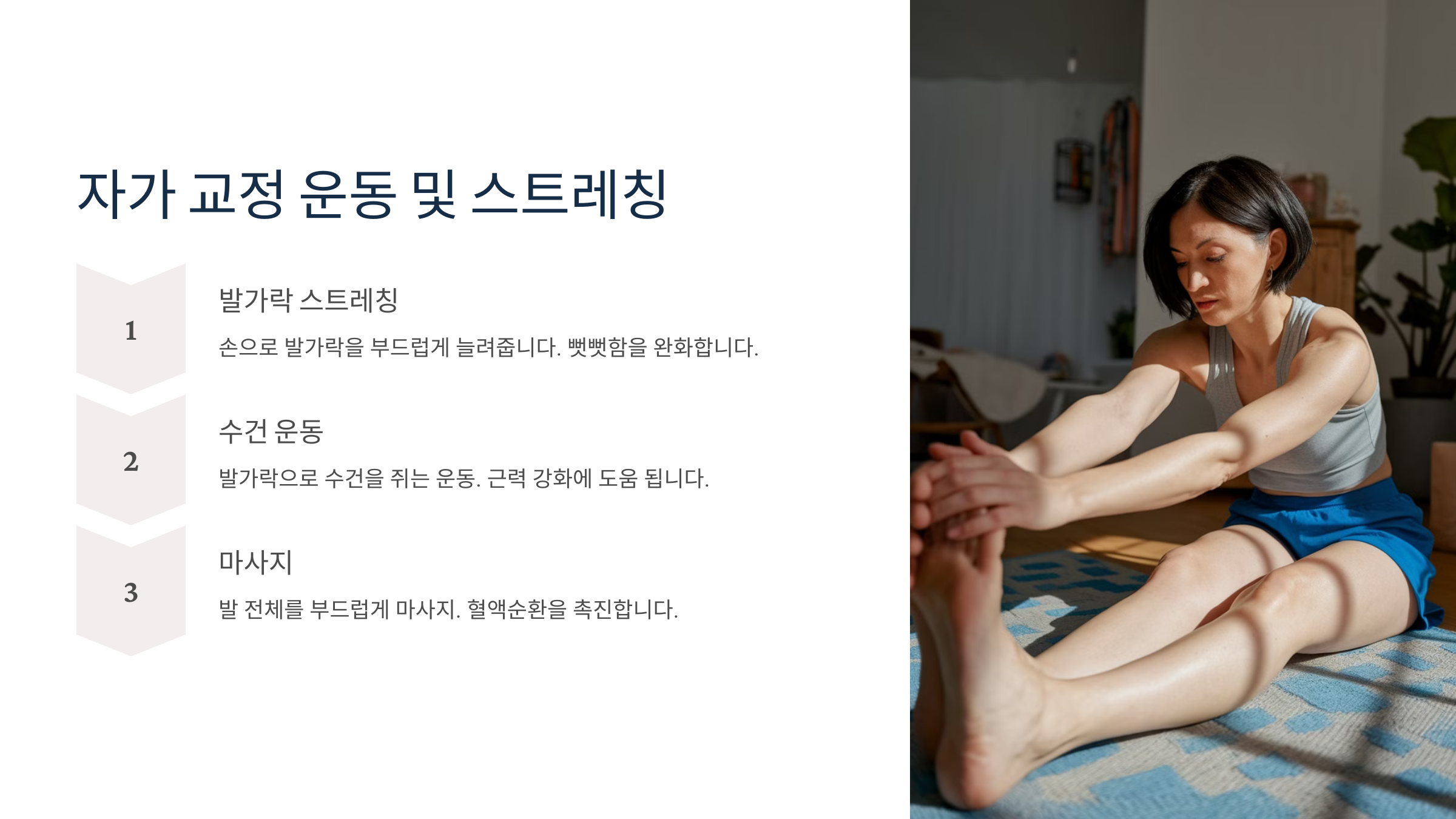 특히 엄지발가락을 바로 잡아주는 동작을 반복하면 발 모양이 더 나빠지는 걸 예방할 수 있어요. 지금부터 집에서 쉽게 따라 할 수 있는 교정 스트레칭을 알려줄게요! 😊
