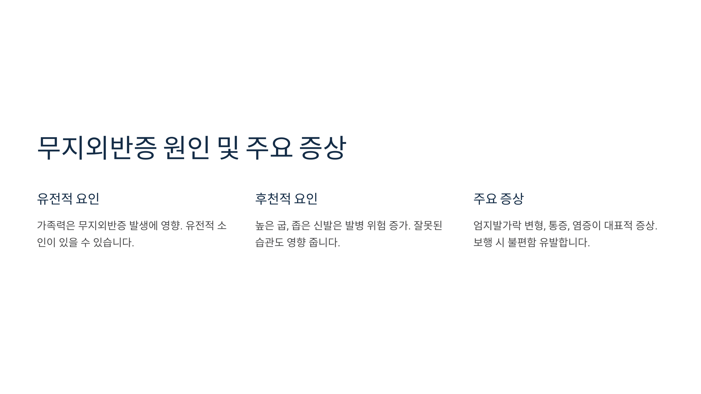 | 유전적 요인 | 가족력이 있는 경우 발 변형이 쉽게 나타날 수 있어요. |