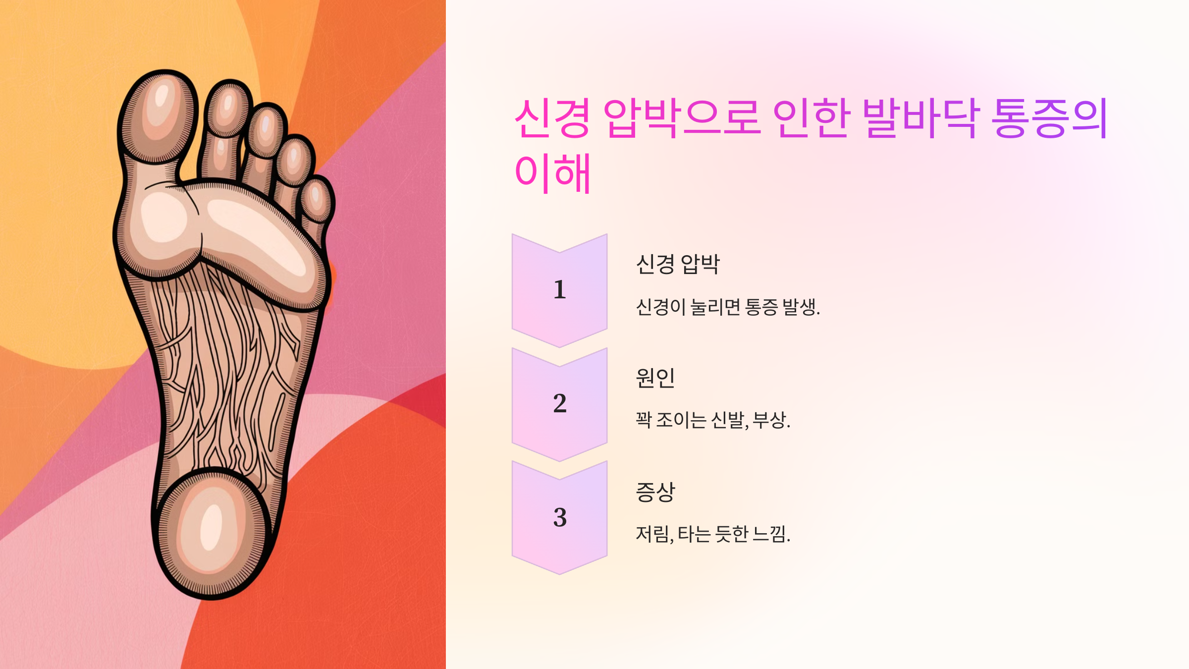 발바닥 통증의 원인 중 하나는 신경 문제일 수 있어요. 특히 신경이 눌리거나 손상되면 저릿한 느낌, 타는 듯한 통증, 감각 저하 같은 증상이 나타날 수 있어요.