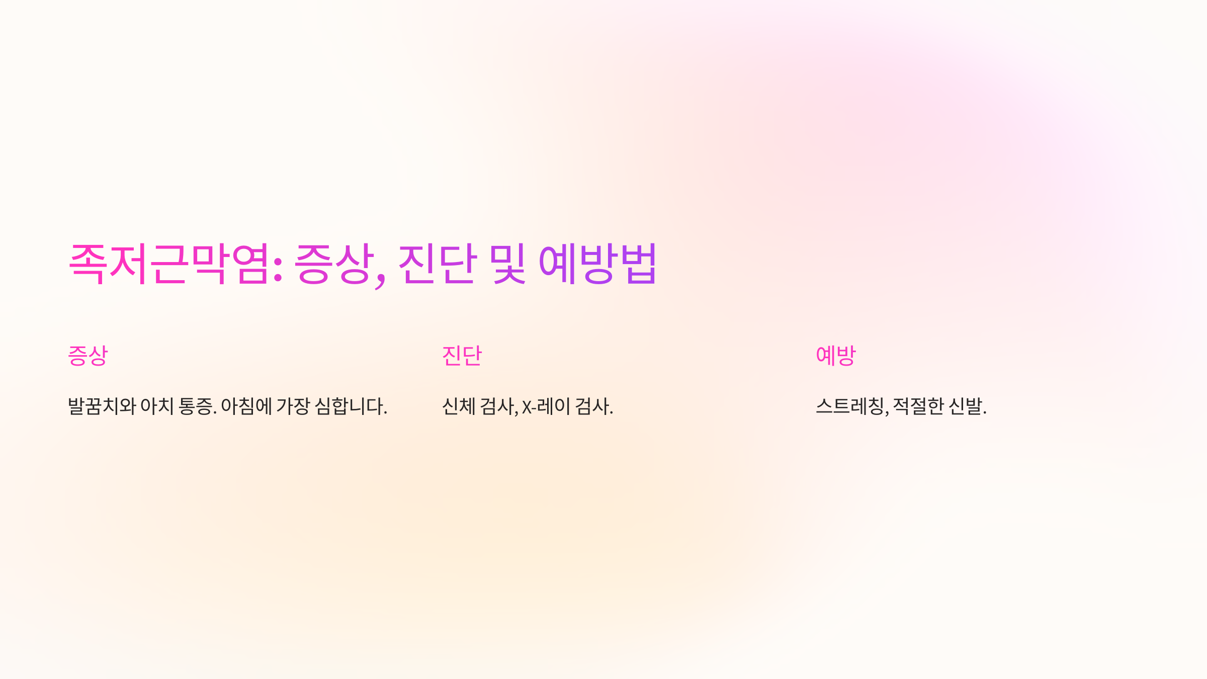 | 족저근막염 | 아침 첫발 통증, 뒤꿈치 통증 | 발바닥 근막 염증 | 스트레칭, 마사지, 깔창 사용 |