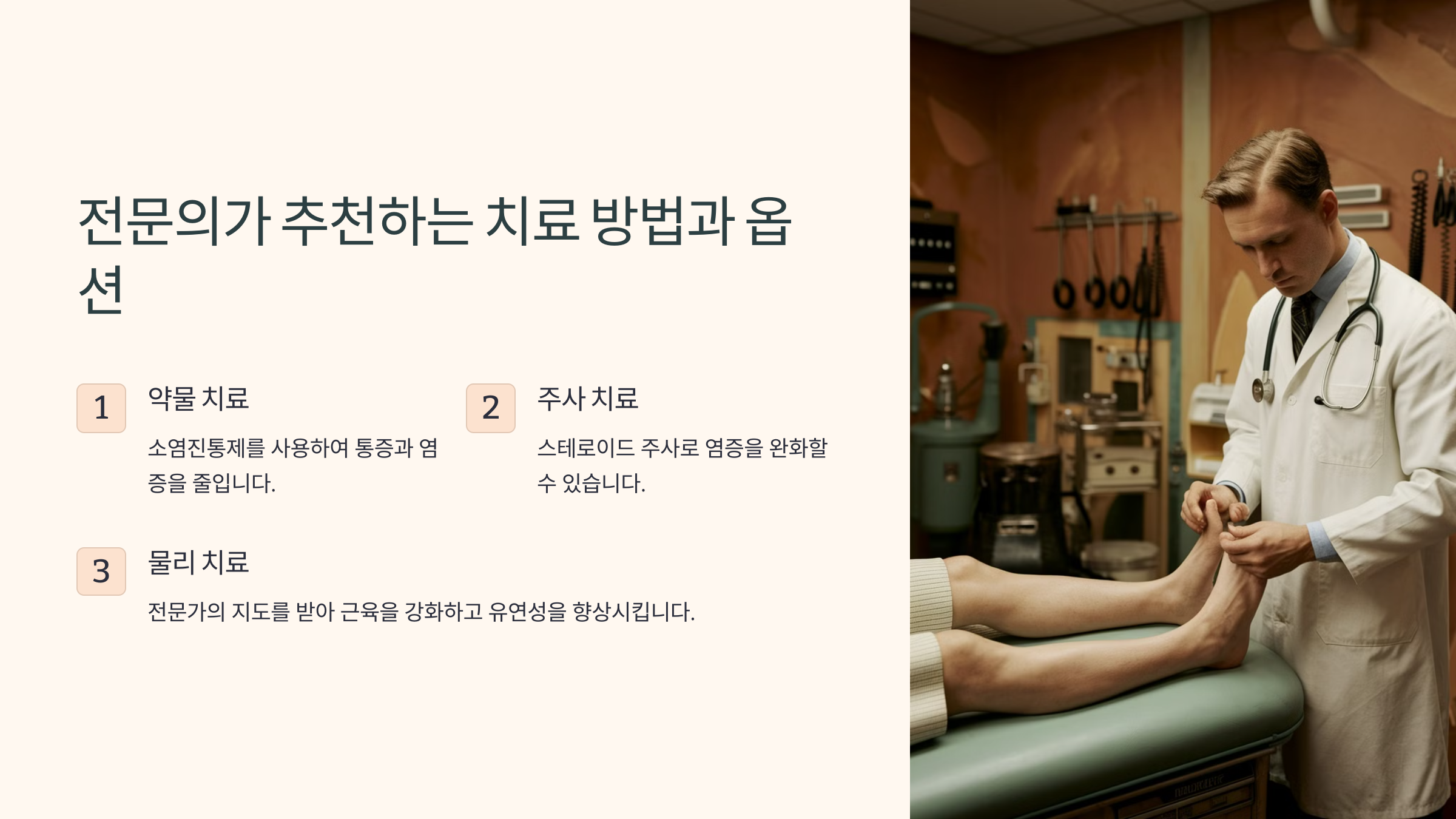이 스트레칭을 꾸준히 하면 발의 유연성이 증가하고 통증이 줄어들어요! 다음 단계에서는 병원에서 받을 수 있는 치료법을 알려드릴게요. 🏥