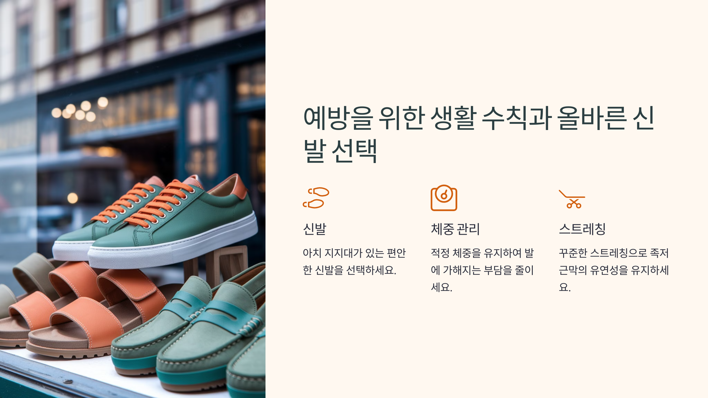 족저근막염은 예방이 가장 중요해요! 생활 습관을 개선하면 통증 없이 편안한 발 건강을 유지할 수 있어요. 다음 섹션에서는 족저근막염 예방에 좋은 신발과 깔창을 추천해 드릴게요. 👟