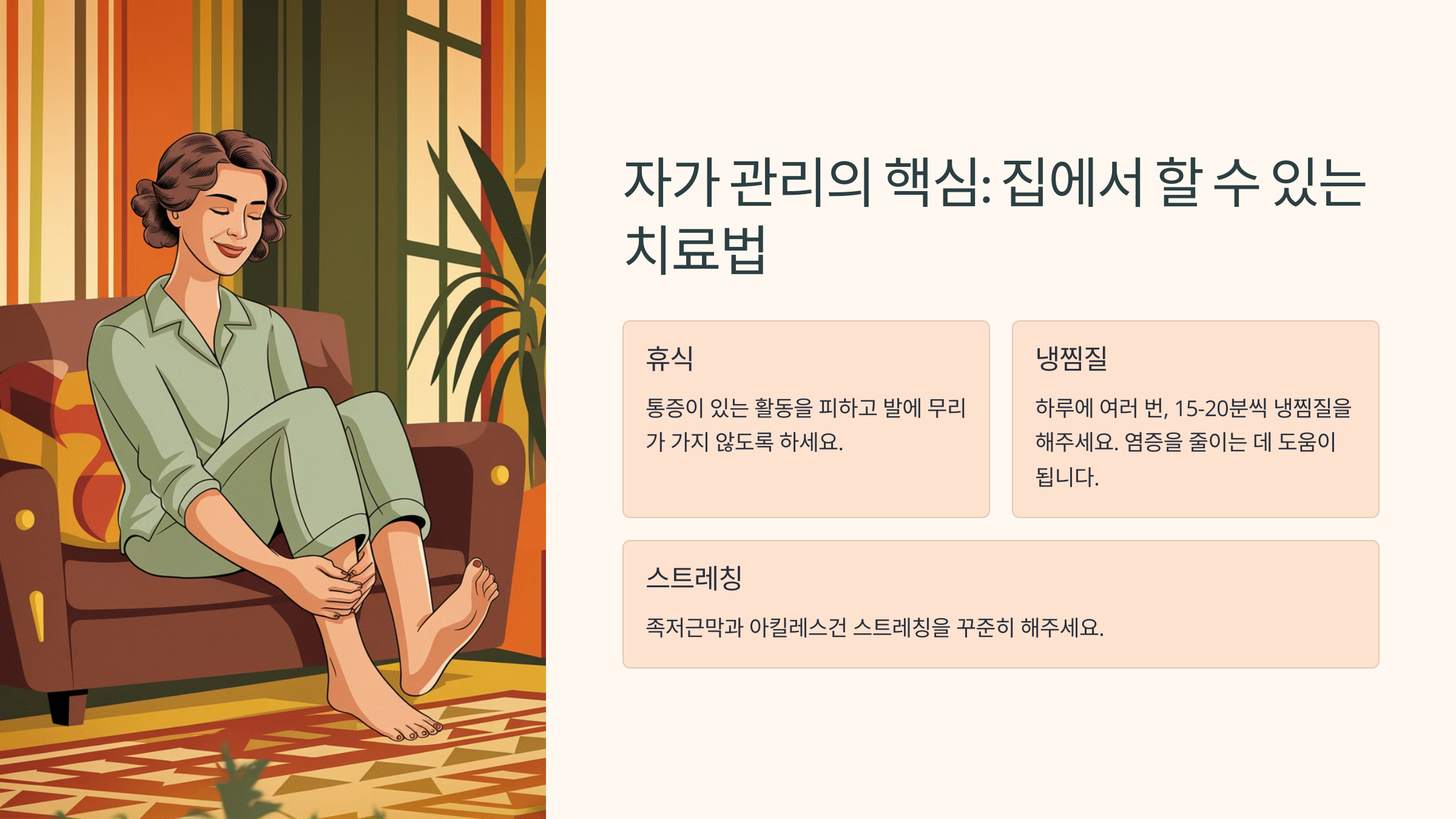 이 방법들을 꾸준히 실천하면 족저근막염 증상을 많이 완화할 수 있어요. 하지만 더 효과적인 치료법이 필요하다면 스트레칭과 운동을 함께하는 것이 좋아요! 😊