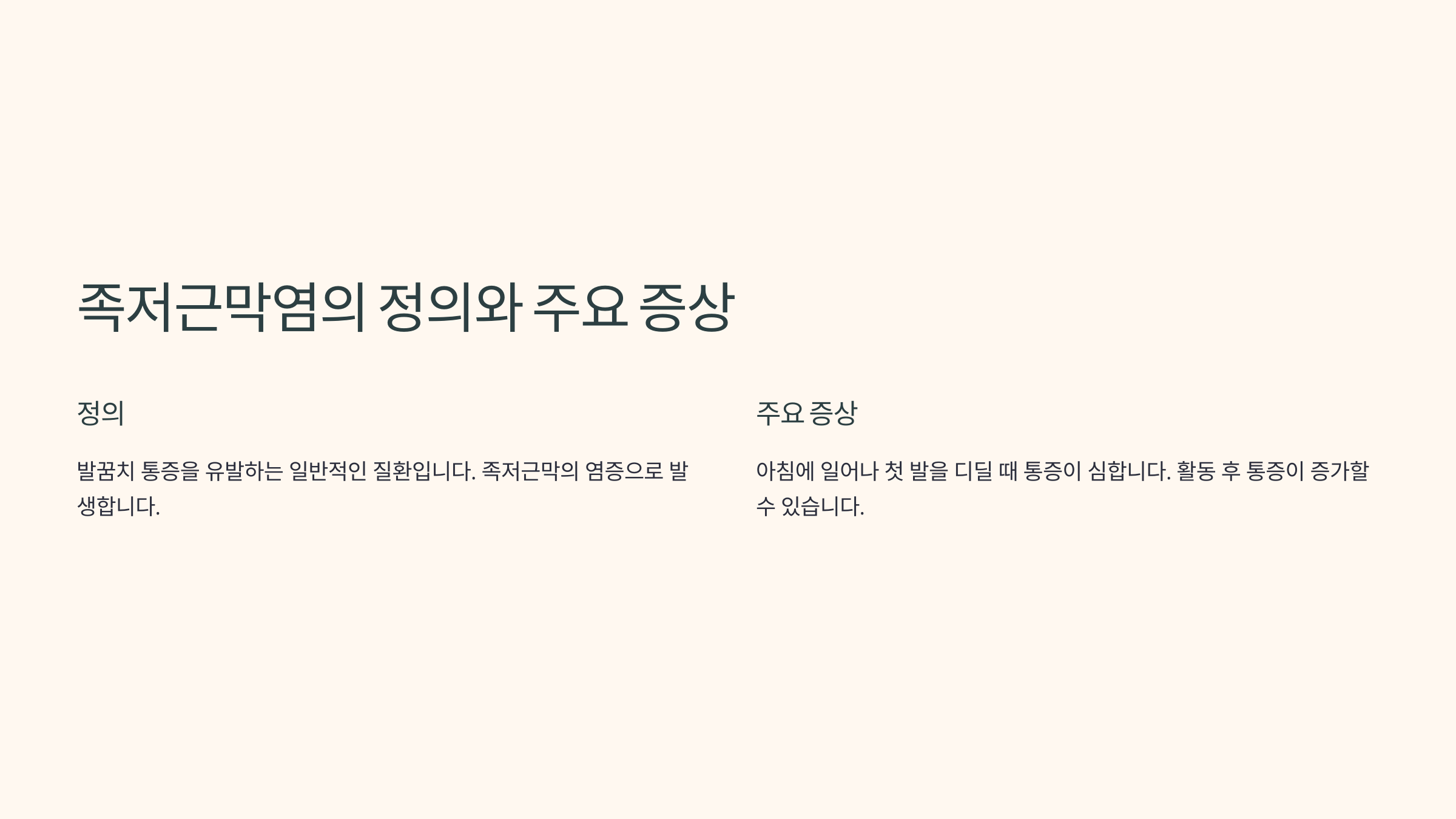주요 증상은 아침에 첫발을 디딜 때 심한 통증이 발생하는 거예요. 움직이면서 통증이 점차 줄어들다가 오랫동안 앉아 있다가 다시 걸으면 또다시 통증이 심해질 수 있어요.