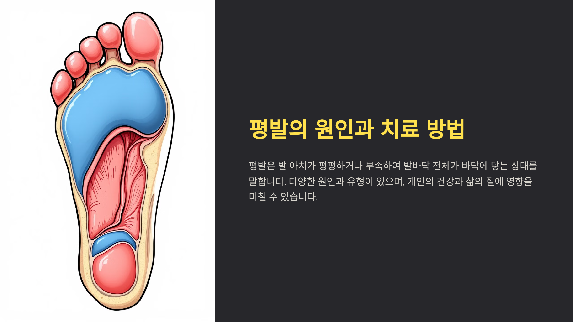 평발은 발바닥의 아치가 낮거나 아예 없는 상태를 말해요. 이로 인해 발이 평평하게 지면에 닿게 되고, 일상생활에서 다양한 불편함을 초래할 수 있어요. 선천적으로 타고나는 경우도 있지만, 생활 습관이나 외상 등 후천적인 요인으로 발생하기도 해요.