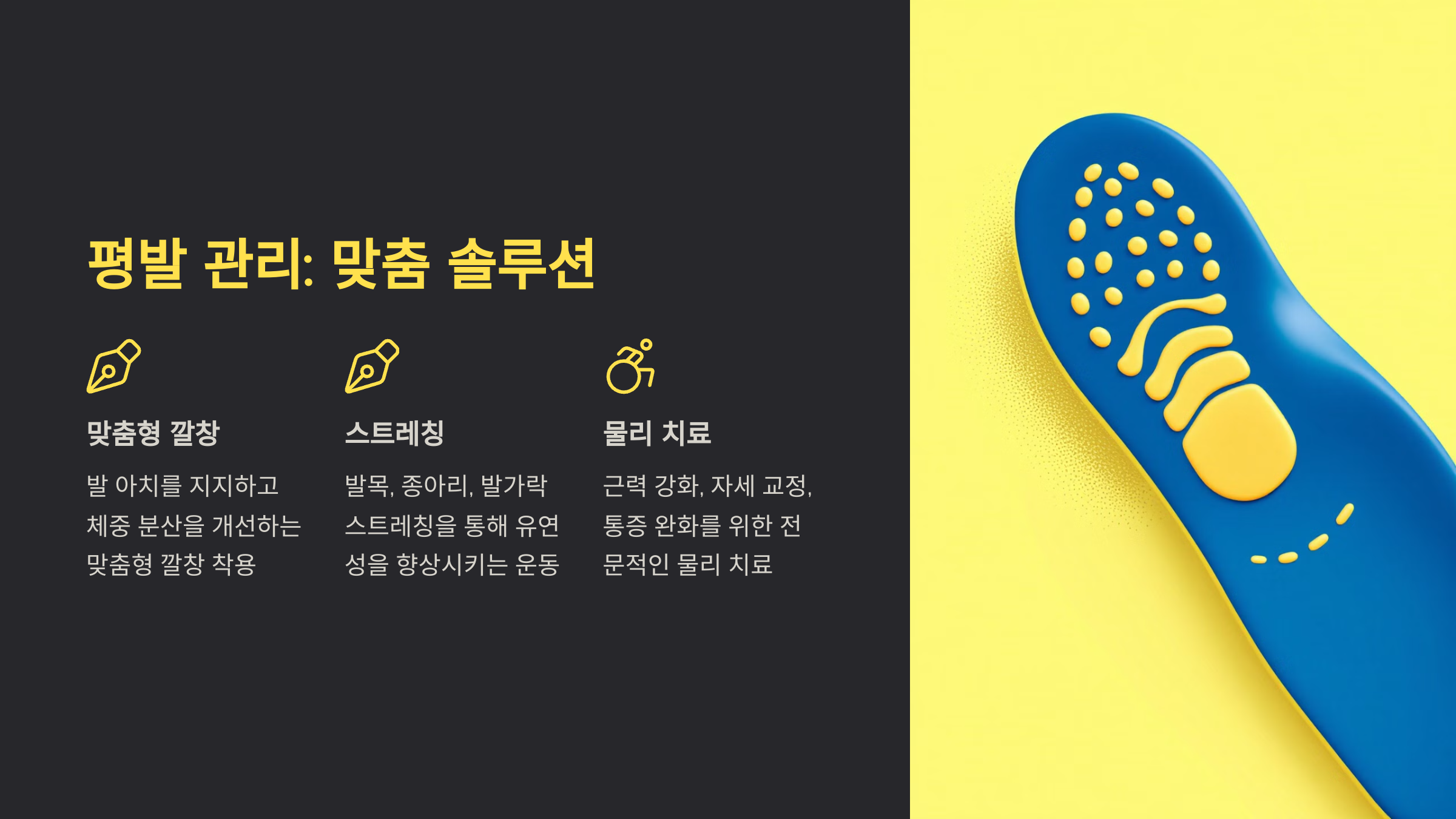 심한 경우에는 물리치료나 교정 운동이 도움이 될 수 있어요. 예를 들어, 발의 근육과 인대를 강화하는 스트레칭 및 운동 프로그램을 통해 발의 구조를 개선하고 통증을 줄일 수 있답니다.
