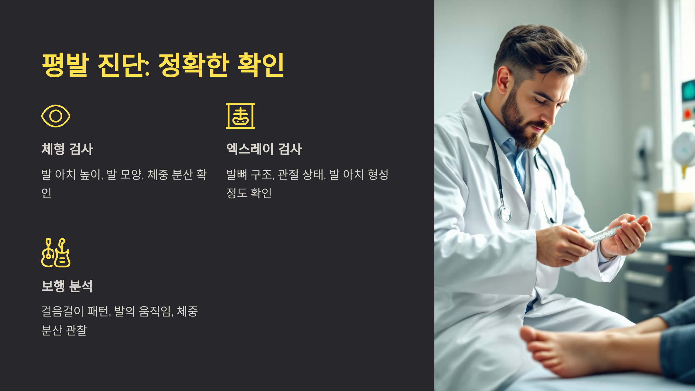 병원을 방문하면 전문적인 검사를 통해 평발 여부를 확인할 수 있어요. 방사선 검사(X-ray)나 발의 움직임을 분석하는 동작 검사 등을 통해 발의 구조와 상태를 정밀히 살펴볼 수 있답니다.
