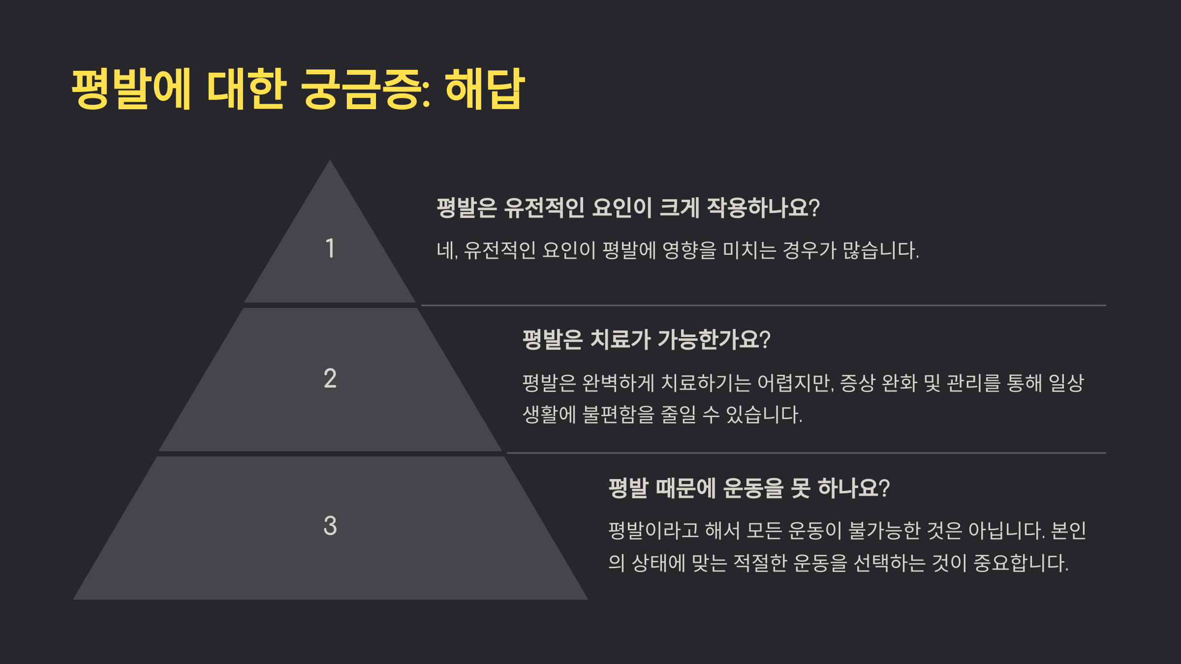 A5. 네, 적절한 운동은 평발 관리에 많은 도움이 돼요. 발 아치를 강화하는 운동이나 스트레칭은 증상 완화에 효과적이에요.