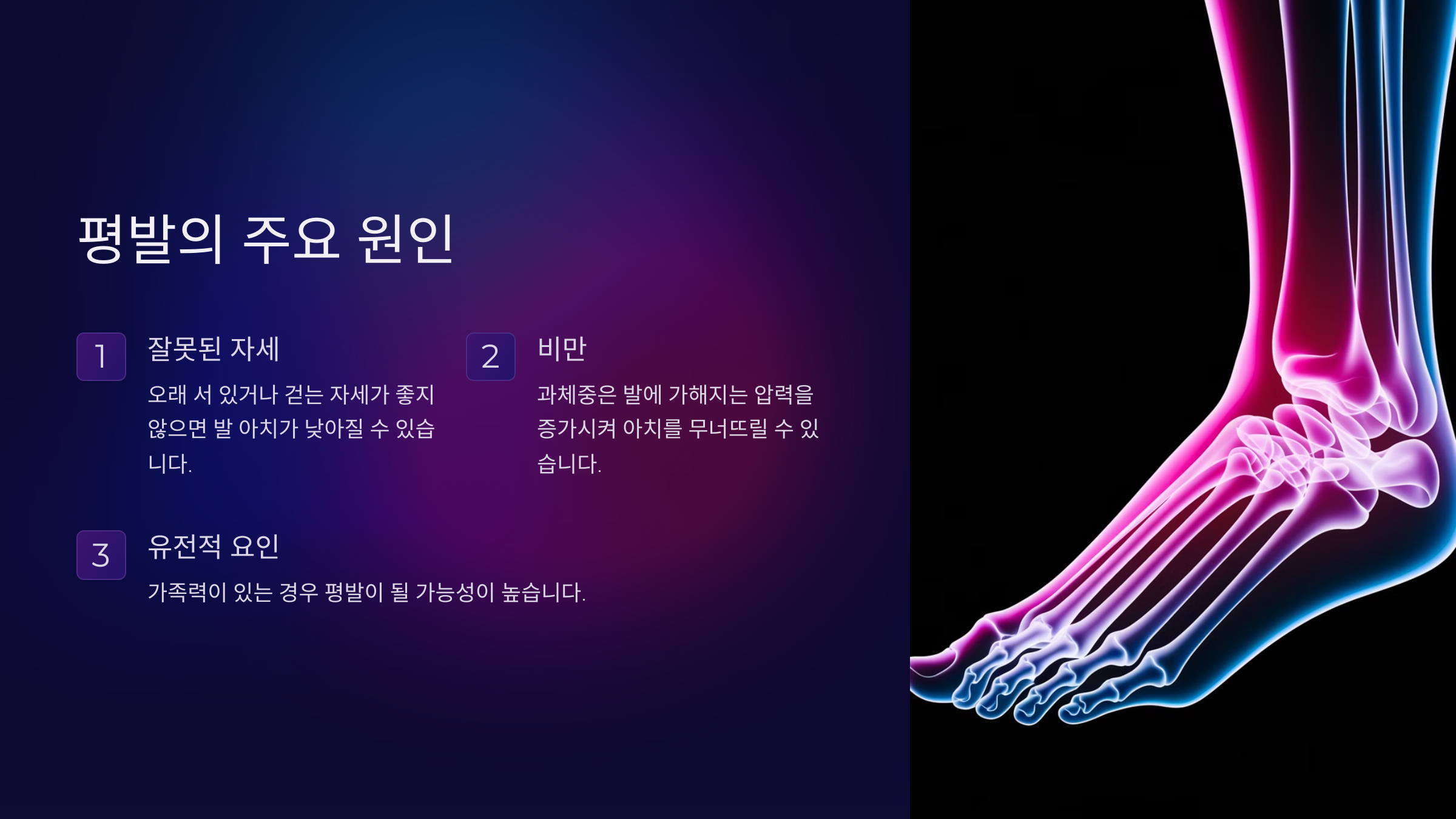- 👶 유전적 요인: 부모에게 평발이 있다면 유전될 가능성이 높아요.