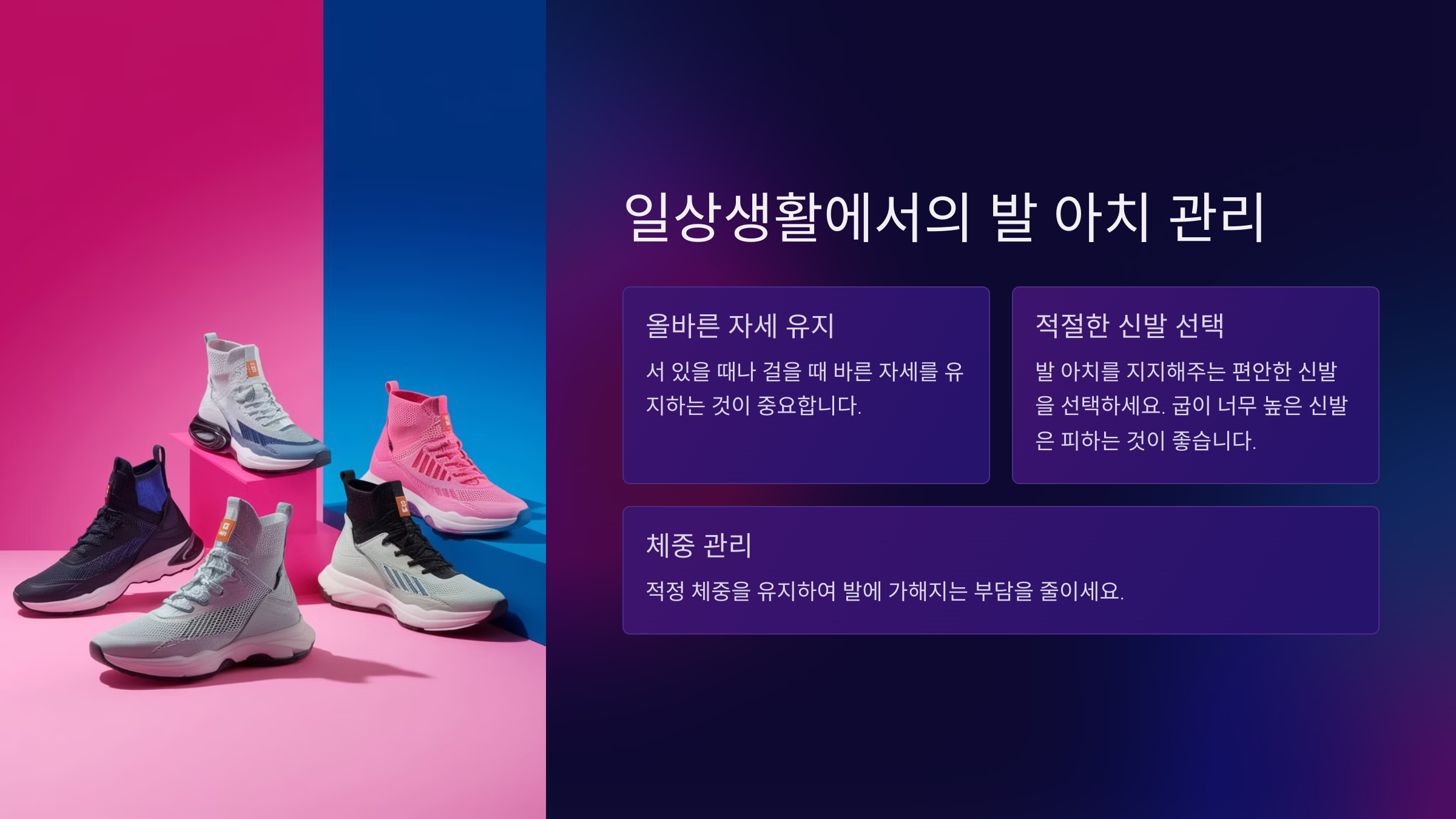 - 👟 발에 맞는 신발 착용: 푹신하고 발을 잘 받쳐주는 신발을 신어요.