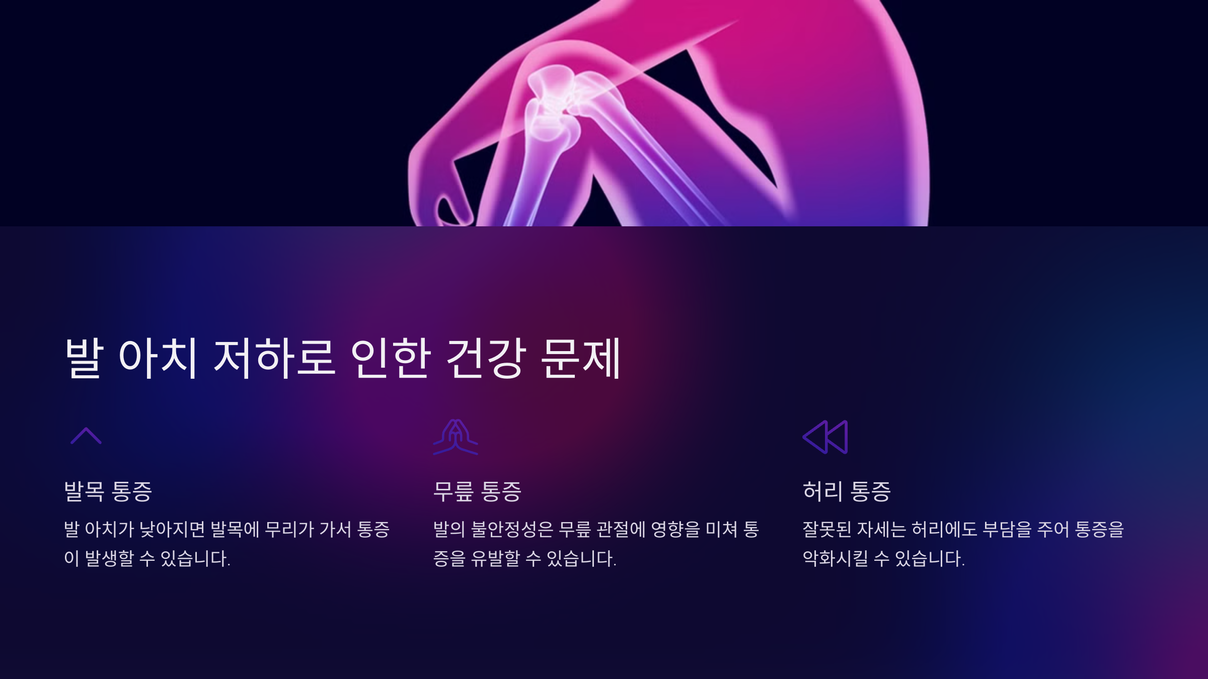 | 족저근막염 | 발바닥 통증을 유발하는 질환으로, 아치가 무너질수록 심해져요. |